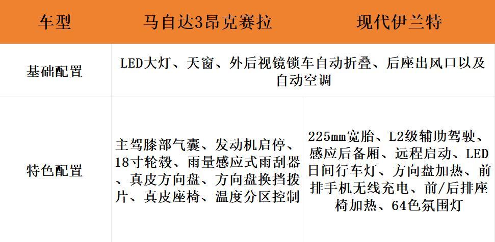 对比来看,两车的配置都能称得上丰富,马自达3昂克赛拉的配置大都集中在看不到的地方,对于驾驶体验和实际的使用感受有帮助,而现代伊兰特在科技感以及舒适性配置方面下了更多的功夫,配置来的更为“讨喜”。
