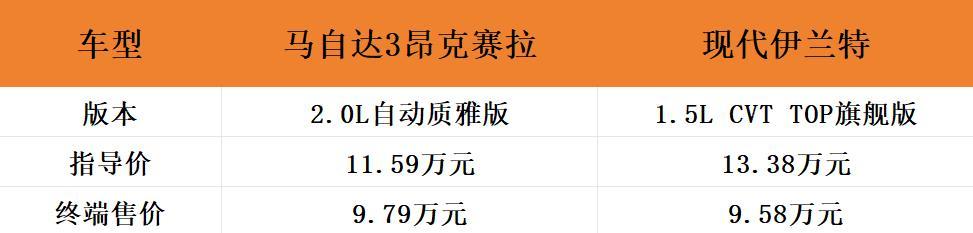 两款车型分别是马自达3昂克赛拉和现代伊兰特,卡着10万元的预算,我们选取到的是马自达3昂克赛拉 2.0L自动质雅版(以下简称马自达3昂克赛拉)以及现代伊兰特 1.5L CVT TOP旗舰版,两台车的官方指导价格分别是11.59万元和13.38万元,目前在终端市场售价均已经来到了10万元以下,接下来我们就从多方面来对比下,家用怎么选更合适?