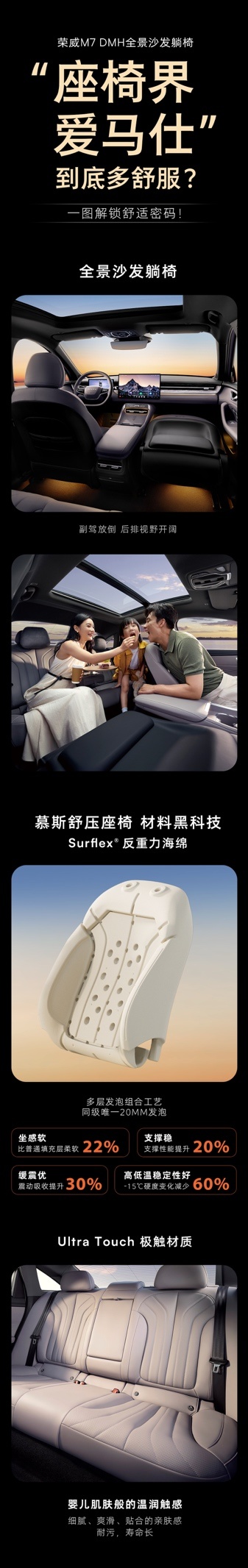 你看,荣威M7 DMH的座椅用到了什么?行业里称之为“Surflex®反重力海绵”。特点是采用多层发泡组合工艺,直接升级到20mm发泡,并且是闭孔蜂巢结构。