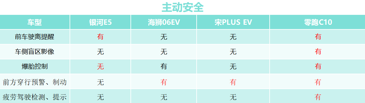 在我们从公开资料中能查询到的主动安全功能上,显然零跑C10的配置要更加的全面一下。不论是盲区检测还是各种主动提醒和检测功能,对于日常驾驶来说都能做到更好的辅助功能,尤其是只有零跑C10和海狮06所搭载的爆胎控制技术,这项技术目前即使是几十万的豪华品牌依旧属于是核心卖点,而在这个级别能给予这样的技术,显然是诚意和技术的双重体现。