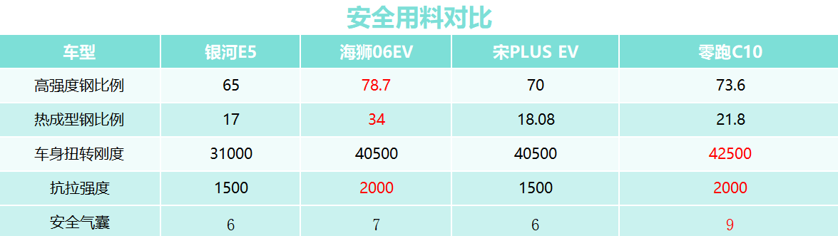 很不幸的是,虽然以上几款车型都是目前行业同价格区间的热门车型。但从以上的数据显而易见的可以看到吉利的银河E5和比亚迪的宋PLUS EV不仅在钢材的空间对比上不占优势,在安全用料的对比上,依旧沦为了陪衬。而刚刚上市的比亚迪海狮06EV和新势力代表车型之一的零跑C10,不仅在钢材的空间对比上杀的难解难分。在安全用料对比上依旧可谓是伯仲之间。但这里要注意的是,零跑C10搭载了9气囊,这9个气囊中的中央气囊,有些品牌也称之为远端气囊,也就是在主副驾中间防止碰撞发生时主副驾乘客碰撞的气囊,是满足欧洲五星安全的必备配置。因此在乘员保护方面,零跑C10显然是具有部分优势的。