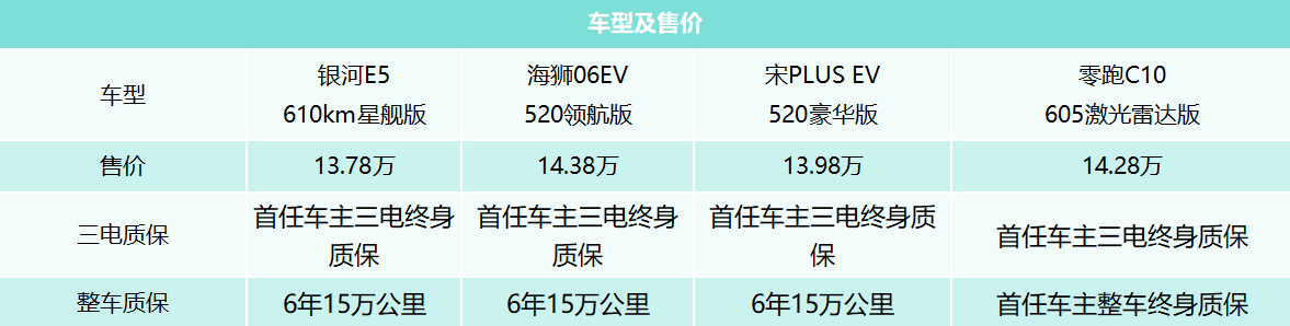 要注意的是,在四款价格类似的产品中,从购车质保政策来说基本都提供了三电的首任车主终身质保。但是在整车质保政策上,则仅有零跑C10提供了首任车主终身质保。因此在后续用车的省心程度上来看,零跑C10的确诚意会更足一些。