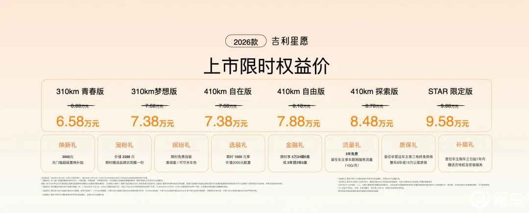 他们上台介绍2026款星愿的升级点时,那种对自己产品的热爱与笃定,极具感染力。我旁边一位媒体同行低声说:“怪不得星愿能成爆款,你看这帮打造它的人,就跟用户没代沟。”这让我深有感触。我买星愿,最初是被它“6万级后驱独悬”的硬核实力吸引。而今天,听他们细致地讲解如何基于用户反馈,把化妆镜加大加了一圈柔光,如何为了3公分的取物便利性去挑战工程极限……我明白了,星愿的成功没有秘密,就是极致的产品主义加上对用户每一个细微需求的真心聆听。惊喜发现,我的星愿又“升值”了作为老车主,看到2026款星愿的上市,非但没有“背刺”的失落,反而更觉欣慰。新车限时权益价6.58万元起,全系标配宁德时代电芯、11合1智能电驱、后置后驱、多连杆独立悬架,这依然是那个“起步即高配”的诚意之作。