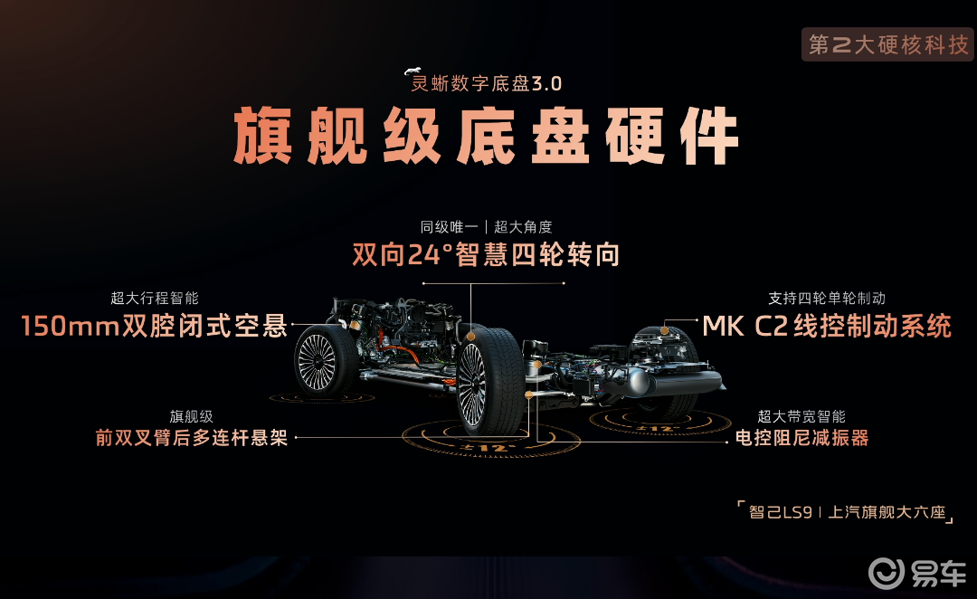智己LS9还搭载灵蜥数字底盘3.0,拥有旗舰级底盘硬件。采用前双叉臂后多连杆悬架,双腔闭式空悬最大行程150mm,双向24°四轮转向系统,整车转弯半径仅4.95m,让大车开出小车一样的灵活!