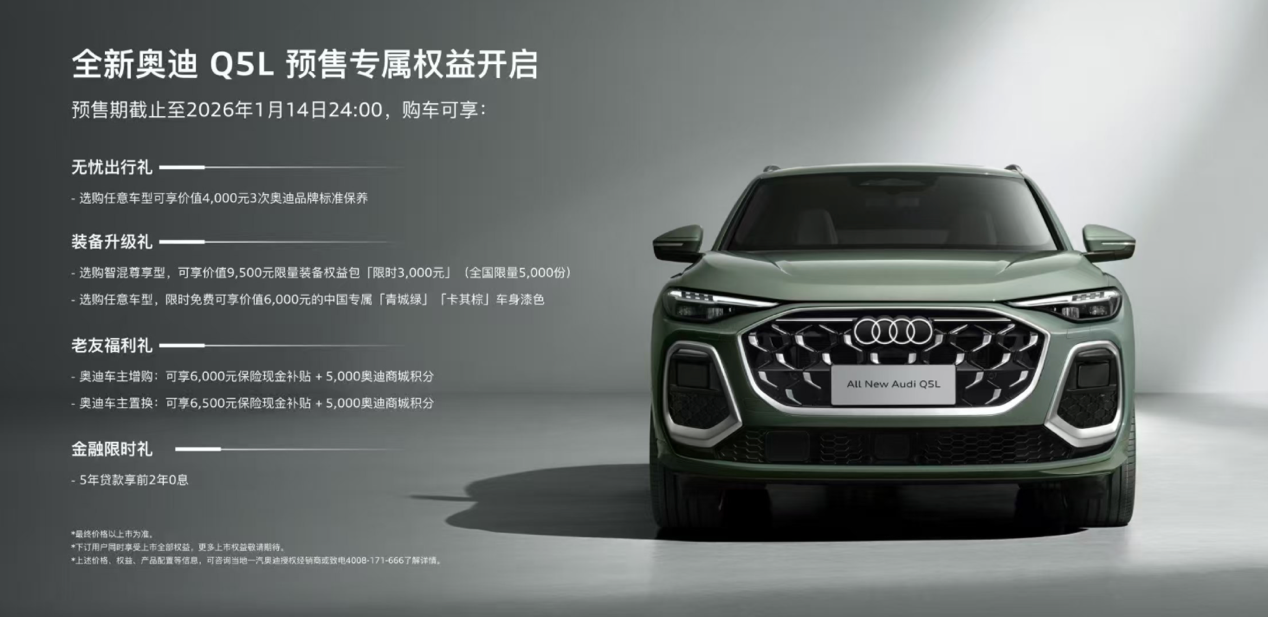 1月15日,奥迪旗下的全新奥迪Q5L以及全新奥迪A6L将一齐首发亮相。作为奥迪家族的两张名片,同时也是奥迪在SUV与轿车两大豪华大分支市场中的主流车型,2025年每卖出一台奥迪,就有50%左右的概率会是奥迪Q5L或者奥迪A6L。由此,两款全新的车型从很大程度上,决定了2026年的奥迪究竟会过得如何。