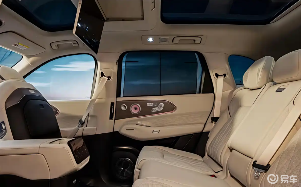 座椅设计兼顾支撑性与舒适性,前排配备多向电动调节功能,后排空间得益于平台架构优势,腿部舒展度表现亮眼,同时提供5座与6座两种布局选择,满足家庭出行与商务场景的多元需求。细节处,车门内饰板的氛围灯组、中央扶手箱的分层储物设计,以及贯穿式空调出风口,既优化了使用体验,也让内饰整体感更为统一。