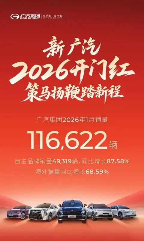2月1日,广汽集团发布2026年1月产销公告。1月全集团整体销量为11.66万辆,同比增长18.47%。其中自主品牌销量超4.9万辆,同比增长87.58%,海外销量同比增长68.59%。
