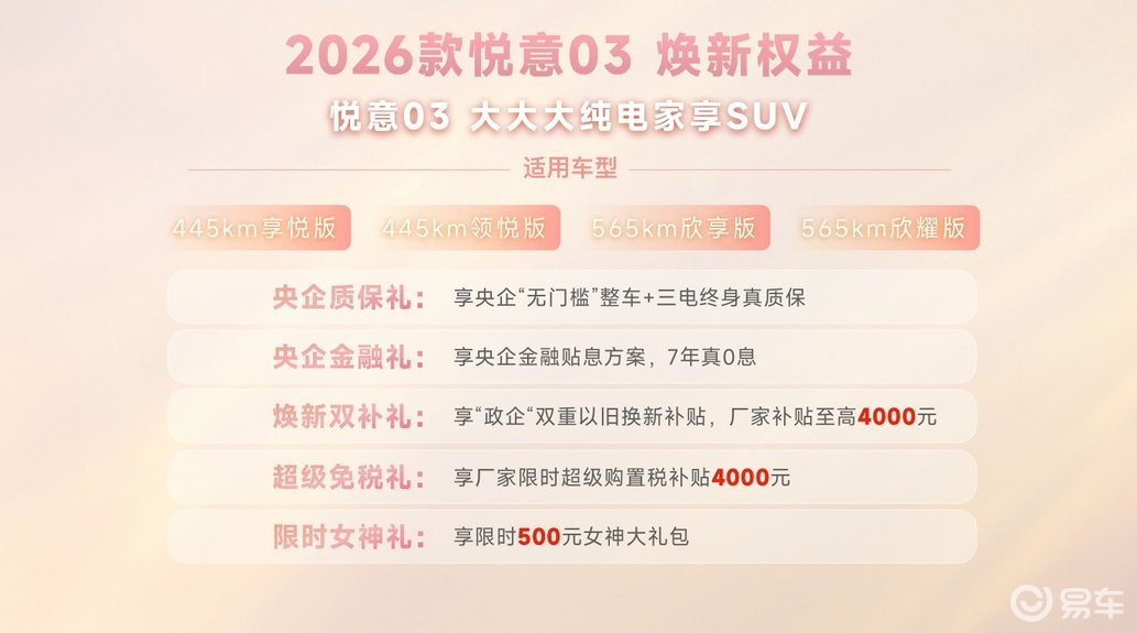 为了让更多家庭轻松拥有这份“悦意”,2026款悦意03还重磅推出央企五重礼遇。购车即享央企质保礼,“无门槛”整车及三电终身质保真诚以待,更有7年真0息央企金融礼,极大降低拥车门槛。