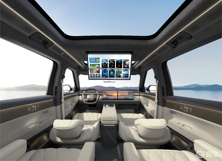 “云栖智舱”配备九屏联动系统,行业首发的Smart Surface魔术屏隐匿于木纹内饰之中,后排门板魔术屏可显示侧后方路况,避免“开门杀”。21.4英寸后排吸顶屏与27扬声器音响打造沉浸式体验。动态零重力座椅配备集成式安全带和坐垫气囊,行车途中也能安心“躺平”。