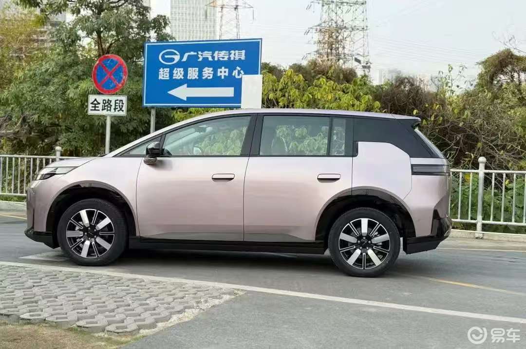 在车身的侧面,我们可以看到埃安N60采用的是非常另类的风格,即便是来到了新能源时代,它的外观也一样很有辨识度,C柱采用了非常特殊的设计语言打造,整体采用了黑化的风格,车顶呈悬浮式的状态。