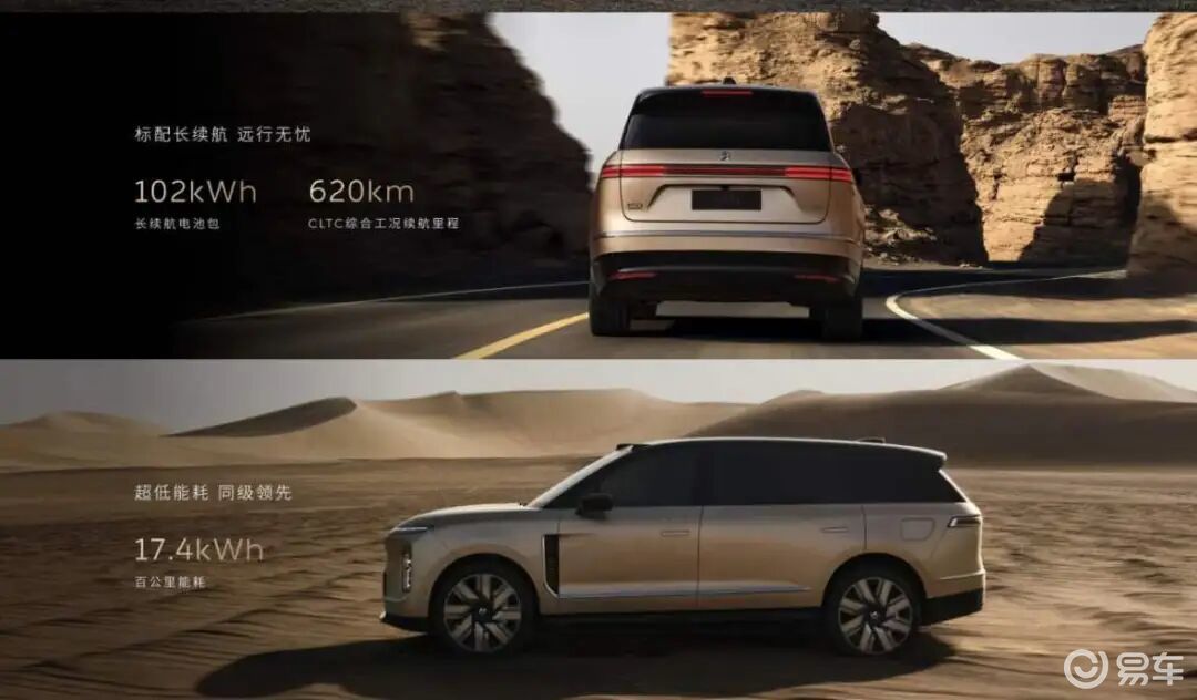 配备有102kWh 电池包,CLTC 续航里程为602km,百公里能耗17.4kWh。