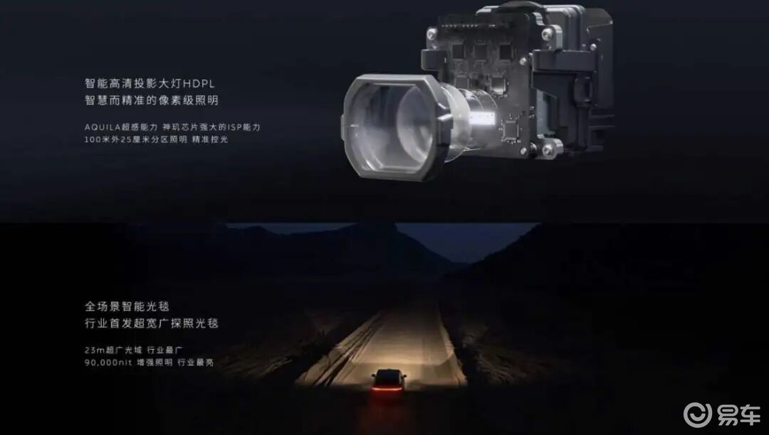 远光可实现超600⽶的超远照射范围,约等于6个⾜球场的⻓度,HDPL智能⾼清投影⼤灯,⾏业⾸发超宽⼴探照光毯功能,可实现⾏业最⼴15⽶宽的⼴域照明,照亮道路两侧细节。