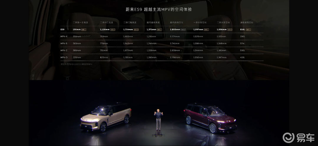 甚至,李斌还拉出来了一个表格,和目前主流的MPV对比,结果就是七项能力全部位列第一,只有一项能力位居第二。
