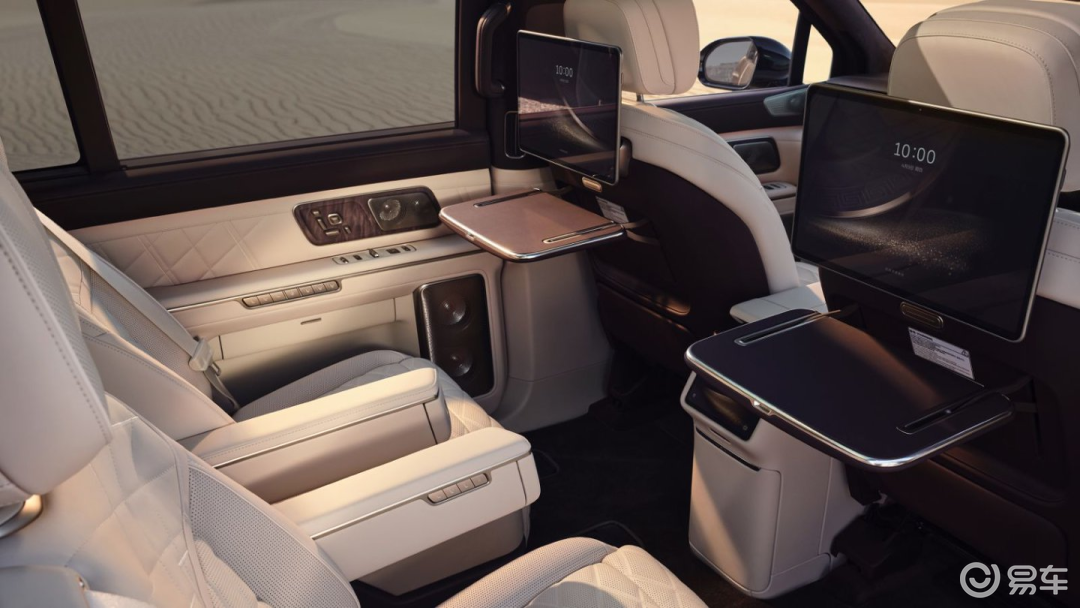 像通风加热按摩都是最基础的,加热区域覆盖了前排椅背、大腿两侧以及门板扶手,几乎只要是身体能接触到的皮面部位都配了加热功能,面积总计达到了 2.3 平方米,两张座椅还各内置一张1m长的可折叠拓展行政桌案,以及一块 8 英寸AMOLED后排中央控制屏(有中岛版)。