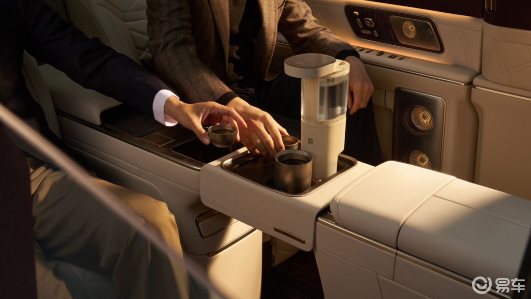 更有一个有意思的,ES9 后排的中岛并没有像 ET9 那样和前排连通,反而设计了一个可以卡在中间的磁吸茶台模块。