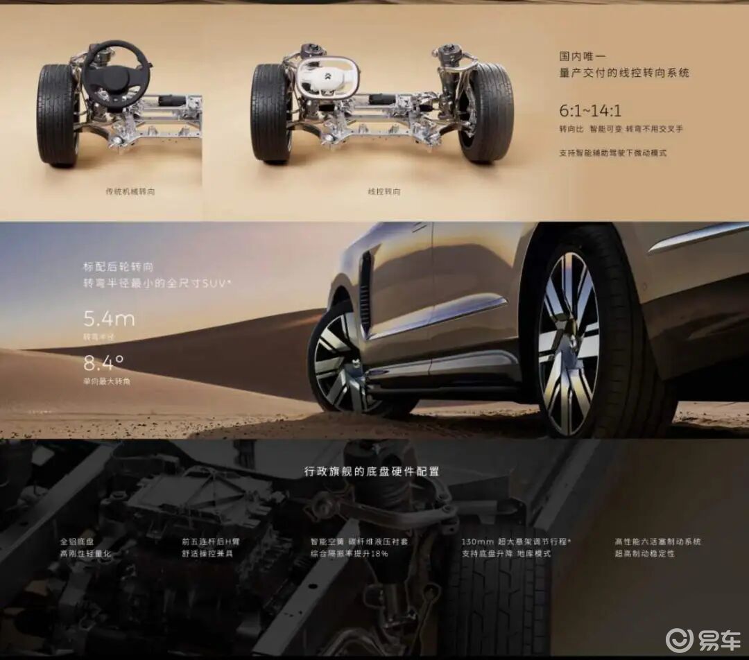 这个底盘集成了线控转向、后轮转向和集成式液压全主动悬架三大核心技术。